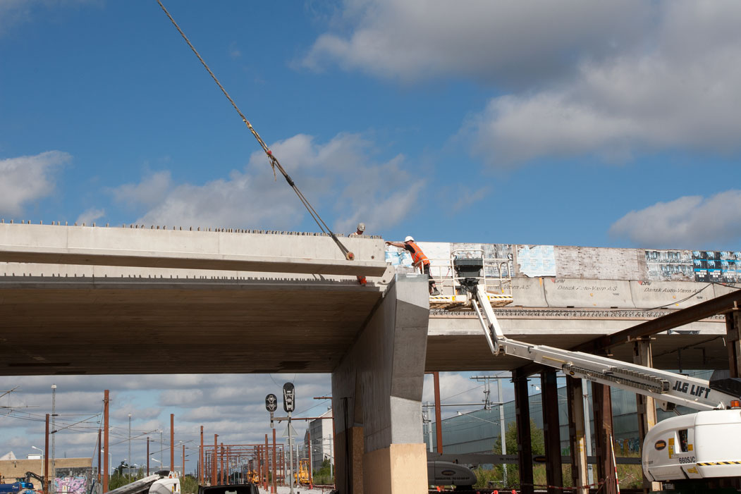 Et eksempel er den traditionelle løsning med OT-bjælker (omvendte T-bjælke) i forspændt beton som underlag for kørebanen med kantbjælker som forspændte RB-bjælker eller KBE-bjælker.
