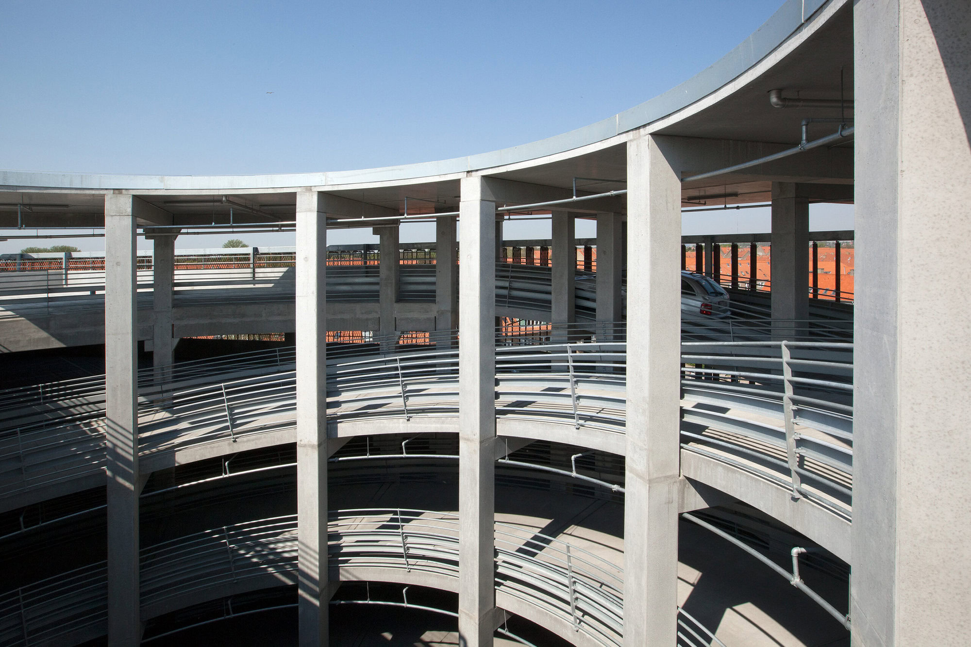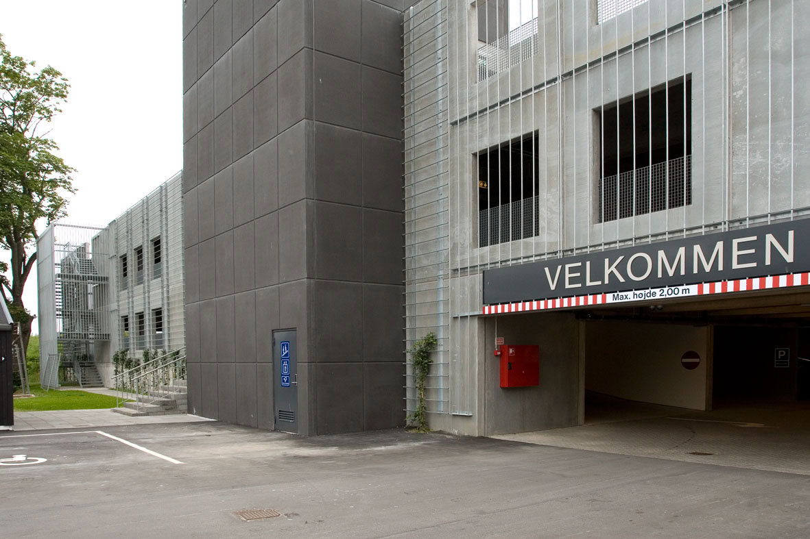 Cirkulært p-hus opført i præfabrikerede betonelementer. Den søjle- og dækbårne konstruktion giver effektiv trafikafvikling, god oversigt og høj strukturel stabilitet.