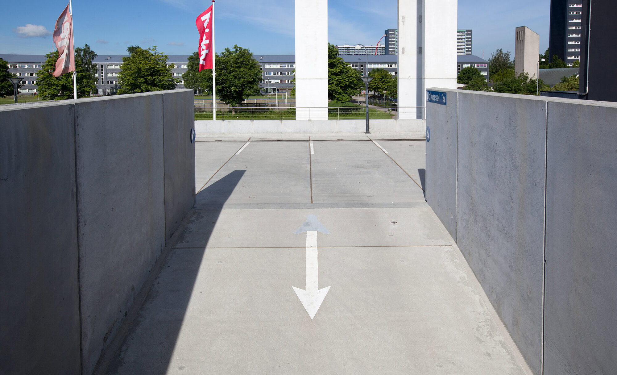 Rampe og trafikzone i præfabrikerede betonelementer. Løsningen sikrer kontrollerede stigninger, stabil konstruktion og overskuelige kørselsforløb.