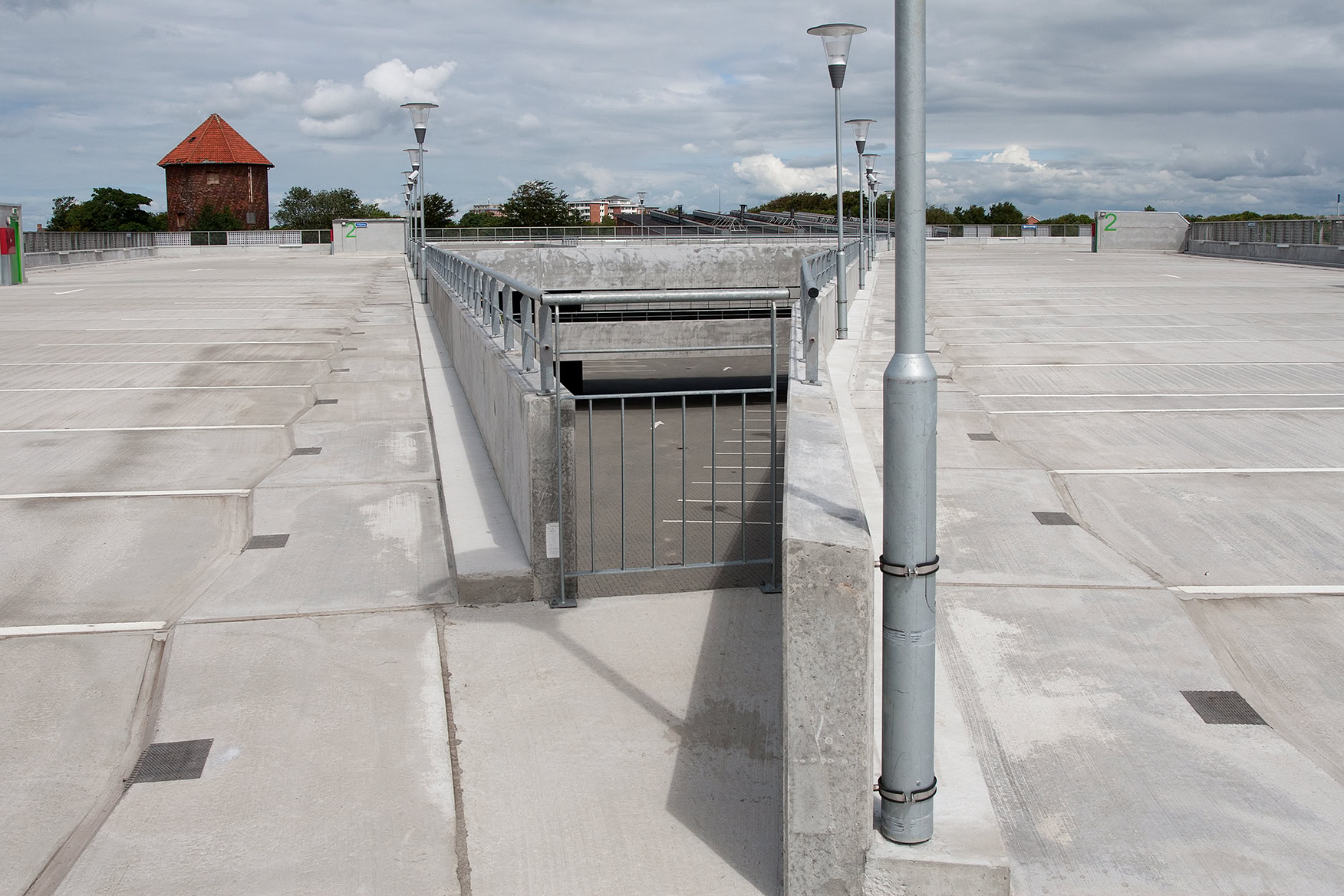 Øverste parkeringsdæk udført i betonelementer med integrerede kanter og værn. Konstruktionen giver klare parkeringsfelter og effektiv afvanding.
