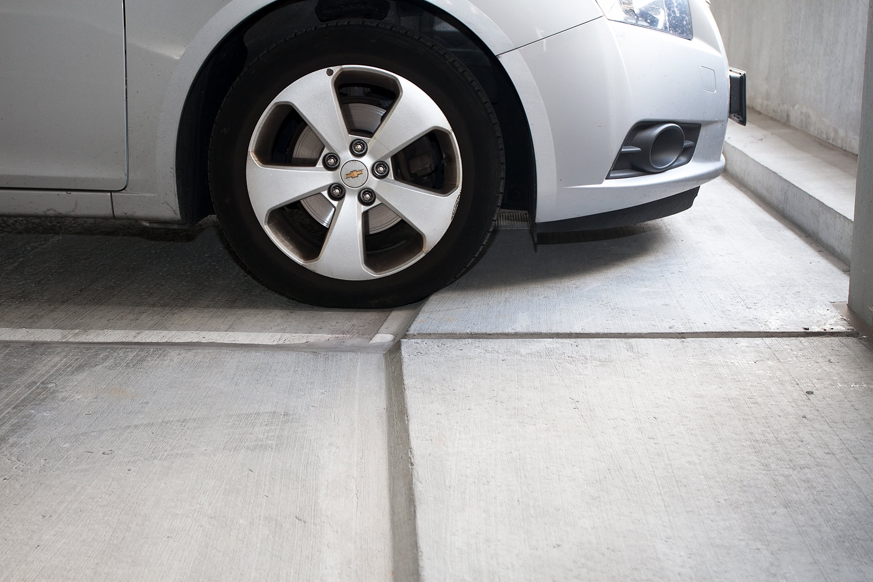 Detalje af kørebane i betonelementer med integreret hjulkant, der forhindrer påkørsel af væg og konstruktion. En enkel, robust løsning, som beskytter både bygning og køretøjer i daglig drift.