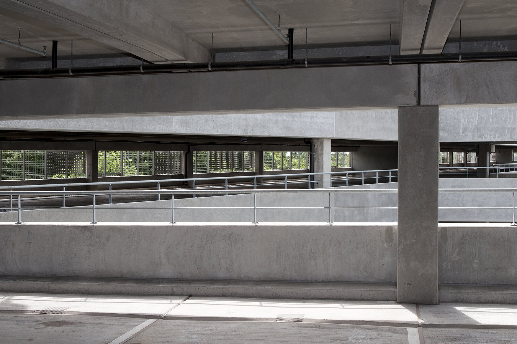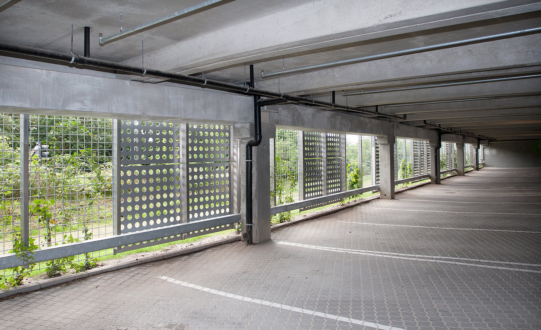 Parkeringsdæk set indefra med gentagelige betonelementer. Systemopbygningen giver rationel opførelse, enkel drift og lang levetid.