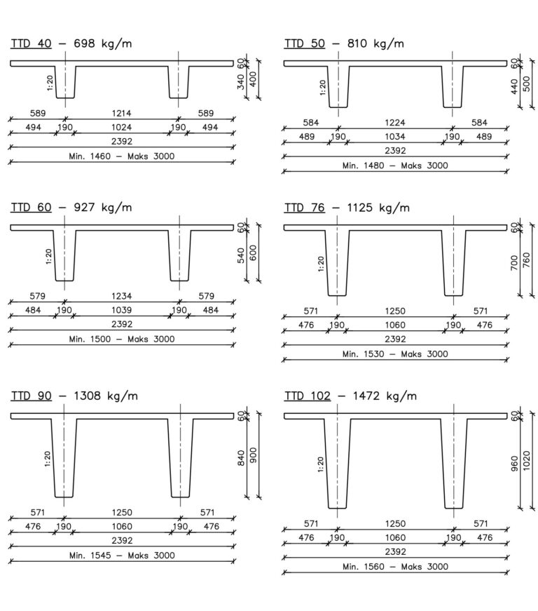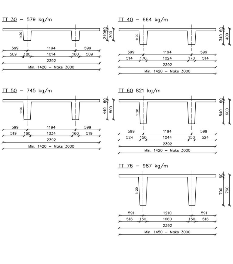 TT-elementerne leveres med understående geometri samt bredder.