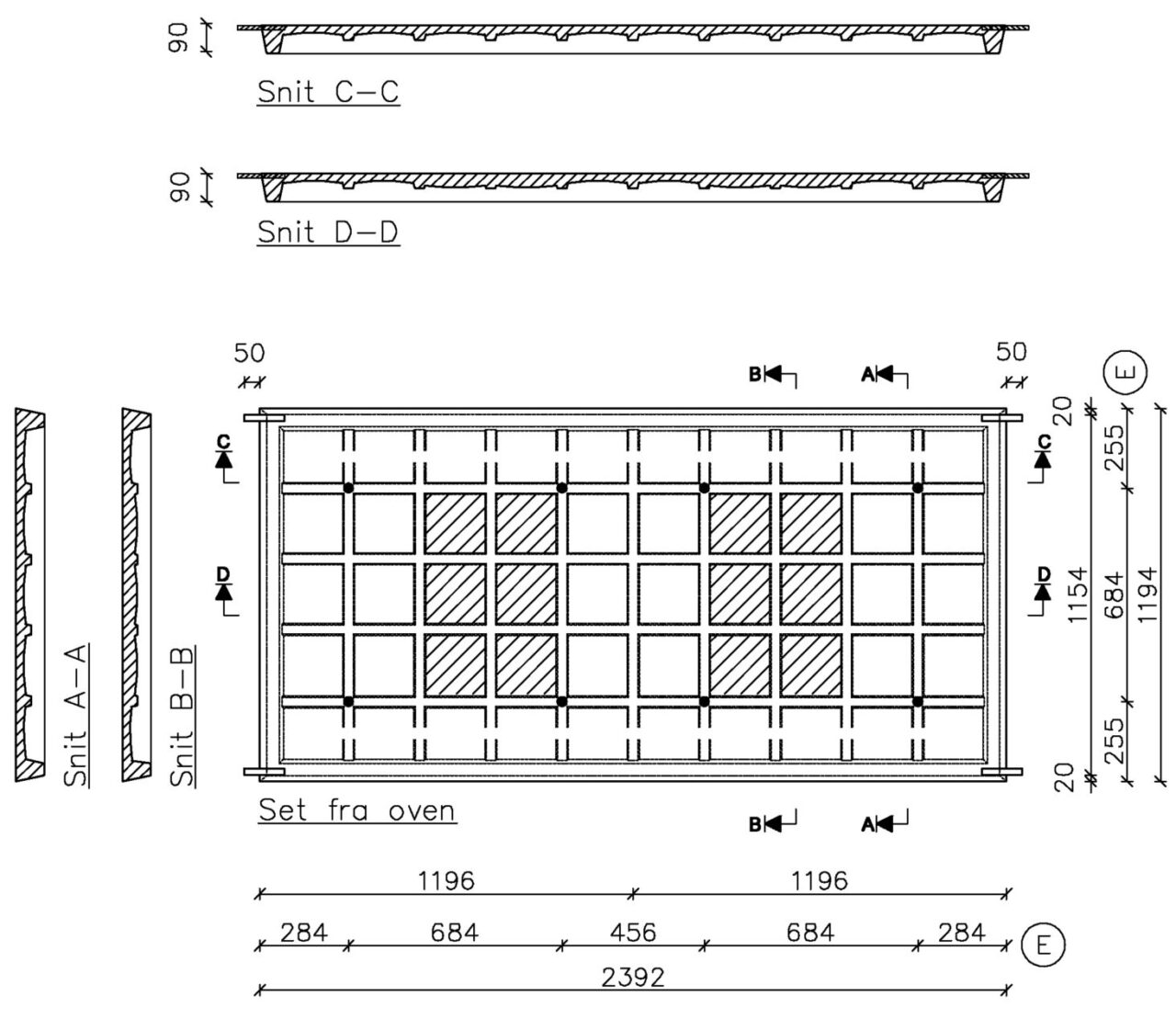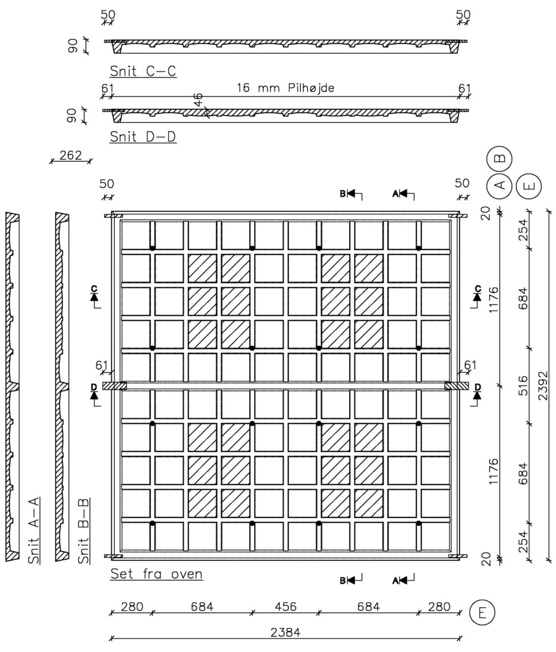 Vaffelpladerne er støbt med en pilhøjde på 16 mm (type U), hvilket stort set svarer til pladens langtidsnedbøjning for egenvægt inkl. isolering og tagdækning.